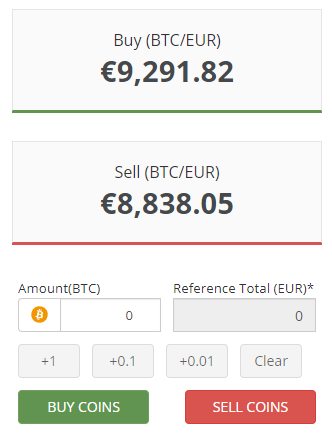 Buy/Sell offers a simpler interface where the buy and sell price are defined by the platform and constantly visible at the top: