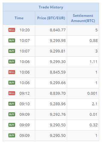 - The table on the left shows the execution history of all recent users of the platform. You can see which amount of currencies other users are buying or selling, and at what price: