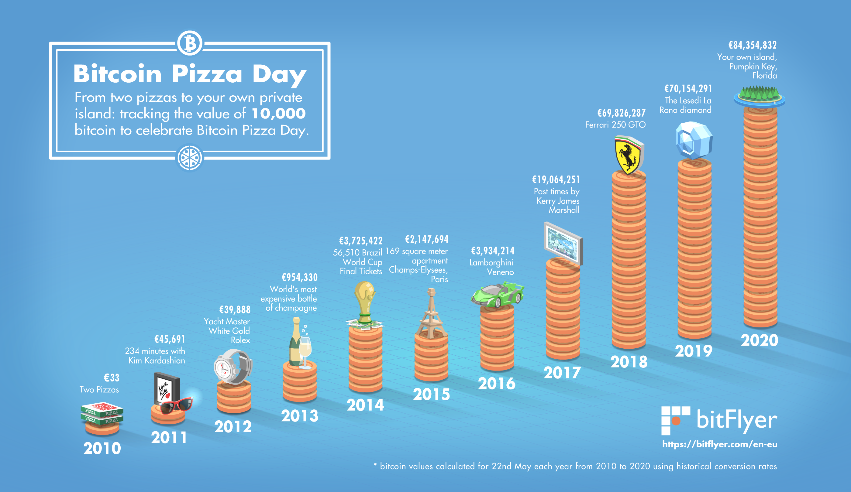We have done a bit of research to find out what you could have bought with 10,000 bitcoins on Bitcoin Pizza Day in 2010 all the way up to today. So what might those bitcoin millionaires amongst you choose to buy to celebrate ten years of Bitcoin Pizza Day?